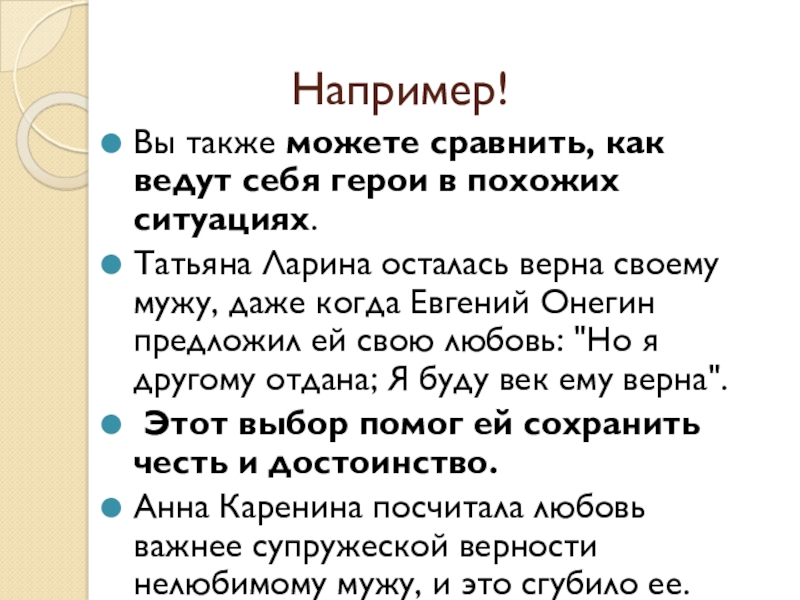 Татьяна Ларина осталась верна своему мужу, даже когда Евгений Онегин предложил ей свою любовь: "Но я другому отдана; Я буду век ему верна".