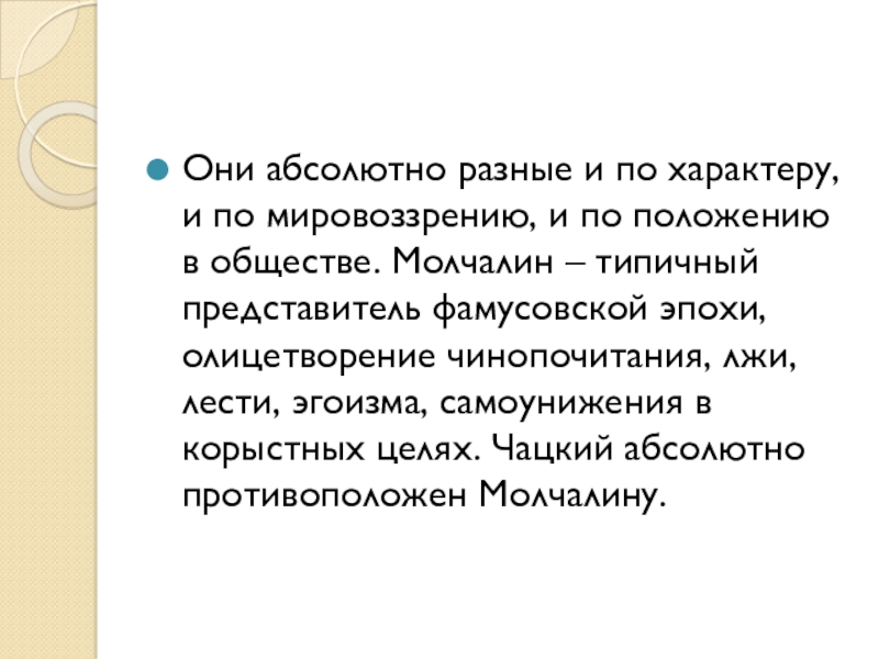 положению в обществе. Молчалин – типичный представитель фамусовской эпохи, олицетворение чинопочитания, лжи, лести, эгоизма, самоунижения в корыстных целях. Чацкий абсолютно противоположен Молчалину.