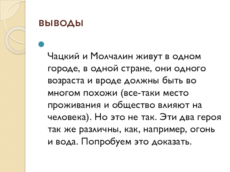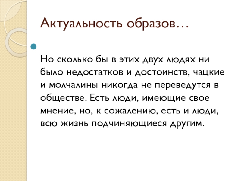 и достоинств, чацкие и молчалины никогда не переведутся в обществе. Есть люди, имеющие свое мнение, но, к сожалению, есть и люди, всю жизнь подчиняющиеся другим.