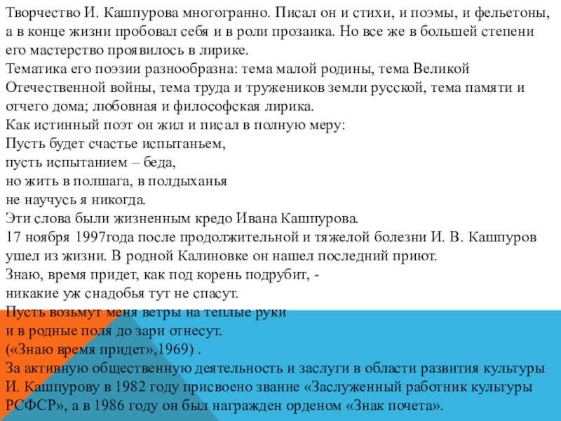 Слайд 18Творчество И. Кашпурова многогранно. Писал он и стихи, и поэмы, и