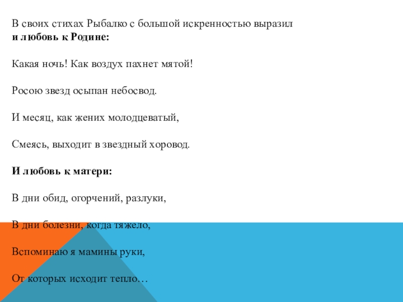 Слайд 23В своих стихах Рыбалко с большой искренностью выразил