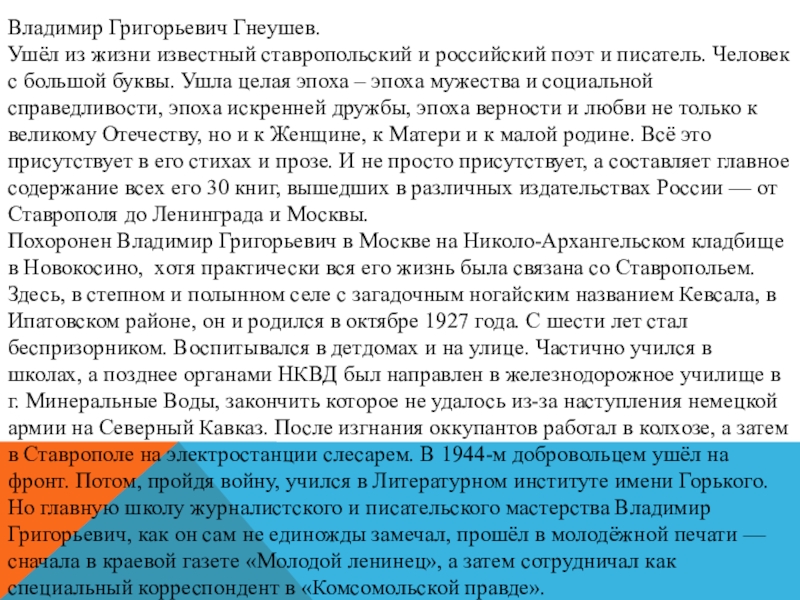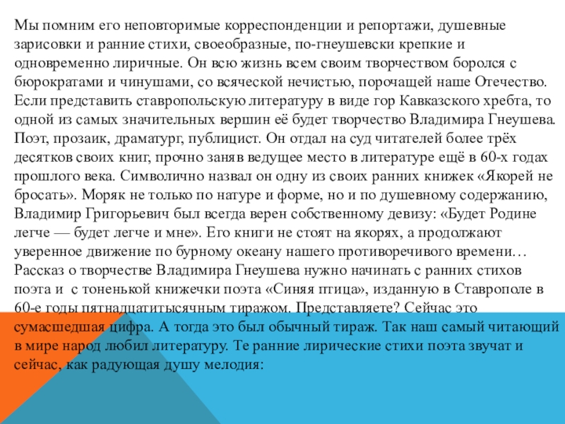 Если представить ставропольскую литературу в виде гор Кавказского хребта, то одной из самых значительных вершин её будет творчество Владимира Гнеушева. Поэт, прозаик, драматург, публицист. Он отдал на суд читателей более трёх десятков своих книг, прочно заняв ведущее место в литературе ещё в 60-х годах прошлого века. Символично назвал он одну из своих ранних книжек «Якорей не бросать». Моряк не только по натуре и форме, но и по душевному содержанию, Владимир Григорьевич был всегда верен собственному девизу: «Будет Родине легче — будет легче и мне». Его книги не стоят на якорях, а продолжают уверенное движение по бурному океану нашего противоречивого времени…