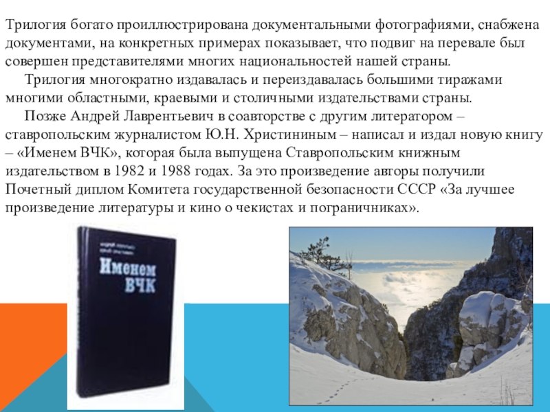 Позже Андрей Лаврентьевич в соавторстве с другим литератором – ставропольским журналистом Ю.Н. Христининым – написал и издал новую книгу – «Именем ВЧК», которая была выпущена Ставропольским книжным издательством в 1982 и 1988 годах. За это произведение авторы получили Почетный диплом Комитета государственной безопасности СССР «За лучшее произведение литературы и кино о чекистах и пограничниках».