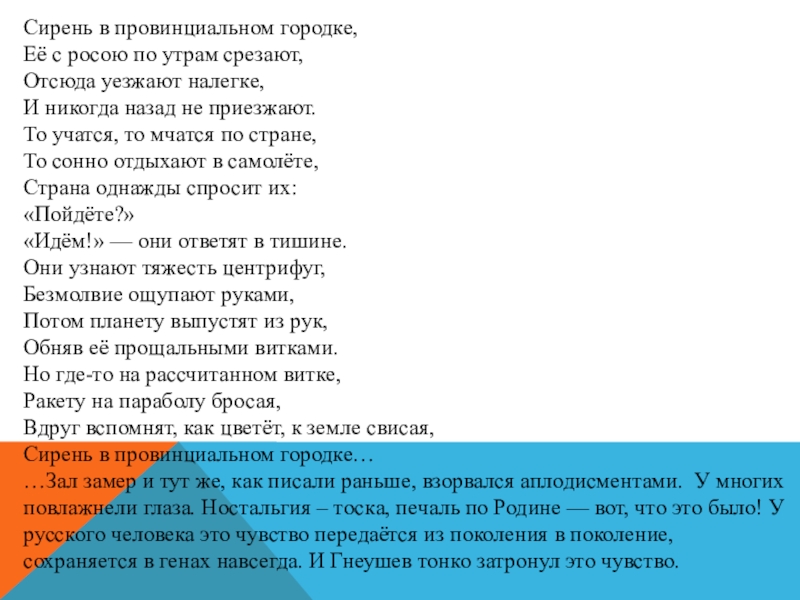 …Зал замер и тут же, как писали раньше, взорвался аплодисментами. У многих повлажнели глаза. Ностальгия – тоска, печаль по Родине — вот, что это было! У русского человека это чувство передаётся из поколения в поколение, сохраняется в генах навсегда. И Гнеушев тонко затронул это чувство.