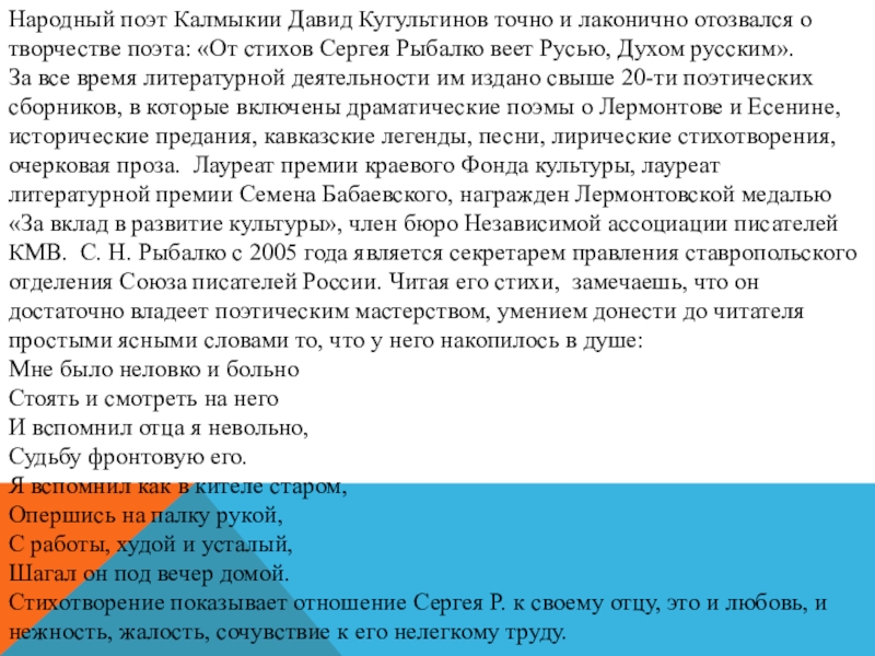 Слайд 21Народный поэт Калмыкии Давид Кугультинов точно и лаконично отозвался о творчестве