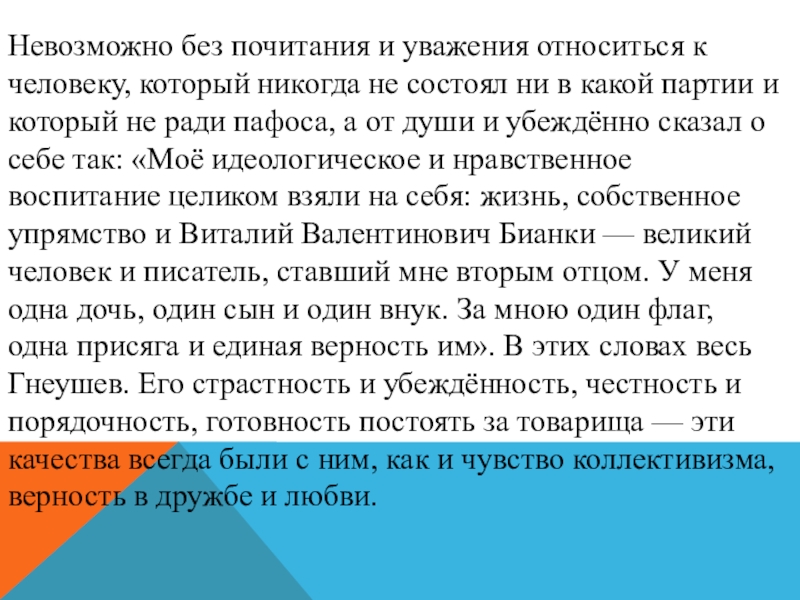 состоял ни в какой партии и который не ради пафоса, а от души и убеждённо сказал о себе так: «Моё идеологическое и нравственное воспитание целиком взяли на себя: жизнь, собственное упрямство и Виталий Валентинович Бианки — великий человек и писатель, ставший мне вторым отцом. У меня одна дочь, один сын и один внук. За мною один флаг, одна присяга и единая верность им». В этих словах весь Гнеушев. Его страстность и убеждённость, честность и порядочность, готовность постоять за товарища — эти качества всегда были с ним, как и чувство коллективизма, верность в дружбе и любви.