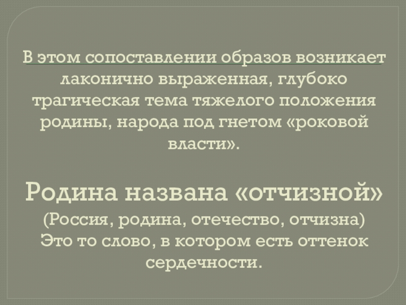 положения родины, народа под гнетом «роковой власти». Родина названа «отчизной» (Россия, родина, отечество, отчизна) Это то слово, в котором есть оттенок сердечности.