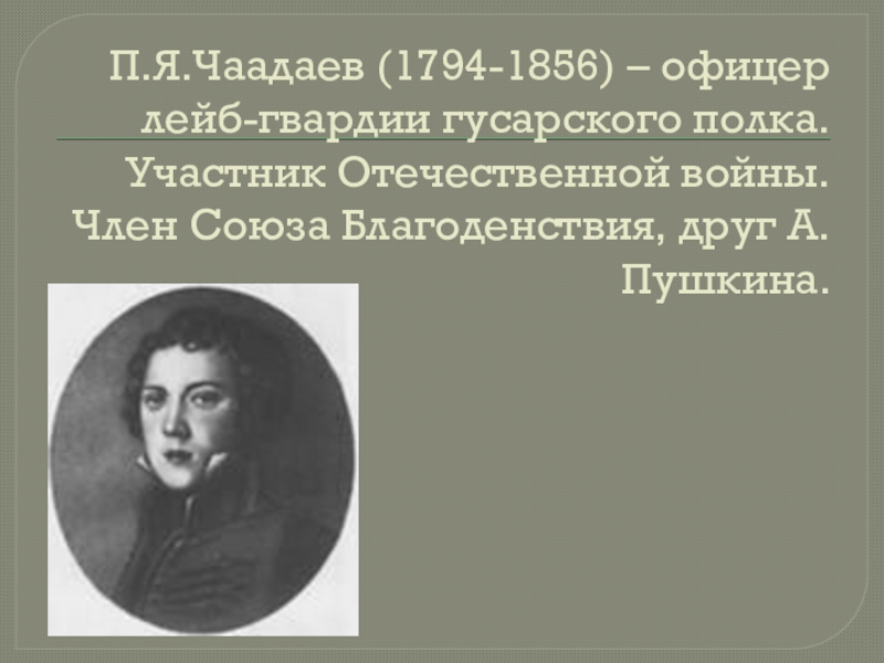 Слайд 2П.Я.Чаадаев (1794-1856) – офицер лейб-гвардии гусарского полка. Участник Отечественной войны. Член