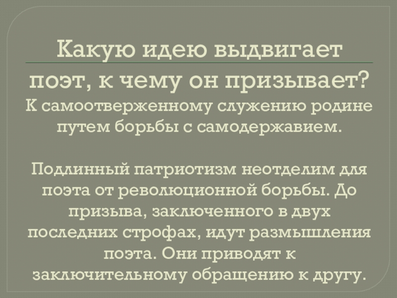 Какую идею выдвигает поэт, к чему он призывает? К самоотверженному служению родине путем борьбы с самодержавием.