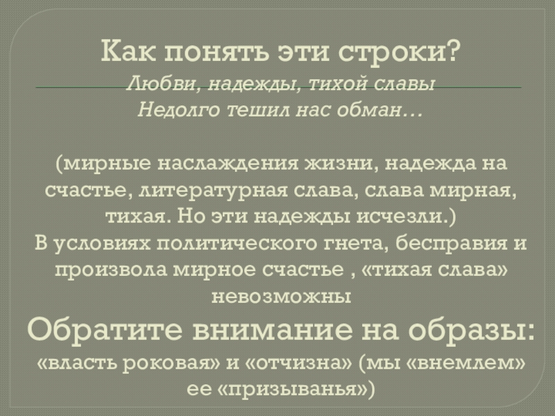 жизни, надежда на счастье, литературная слава, слава мирная, тихая. Но эти надежды исчезли.) В условиях политического гнета, бесправия и произвола мирное счастье , «тихая слава» невозможны Обратите внимание на образы: «власть роковая» и «отчизна» (мы «внемлем» ее «призыванья»)