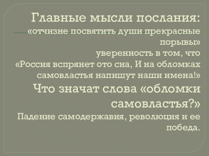 Главные мысли послания: «отчизне посвятить души прекрасные порывы» уверенность в том, что «Россия вспрянет ото сна, И