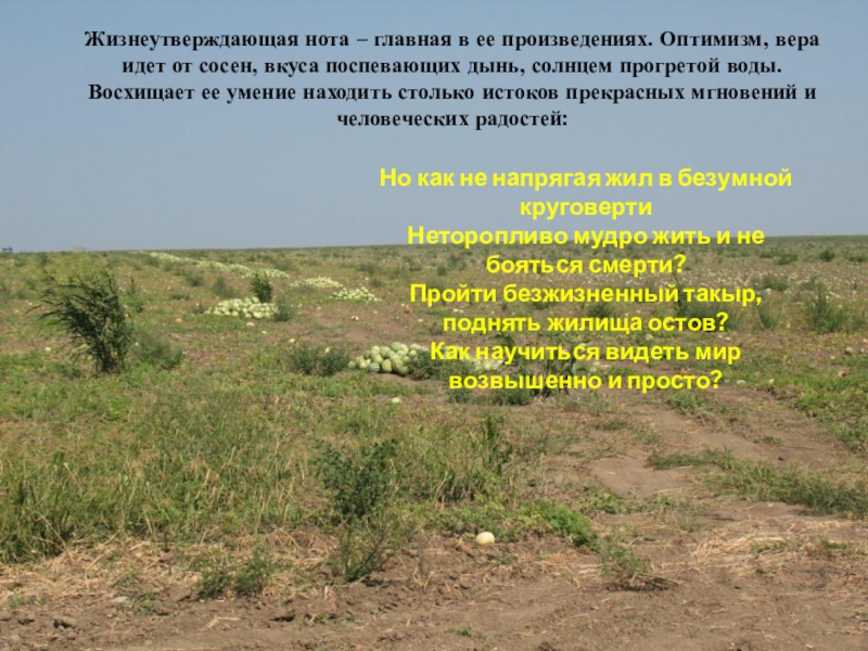 Жизнеутверждающая нота – главная в ее произведениях. Оптимизм, вера идет от сосен, вкуса поспевающих дынь, солнцем прогретой воды. Восхищает ее умение находить столько истоков прекрасных мгновений и человеческих радостей: