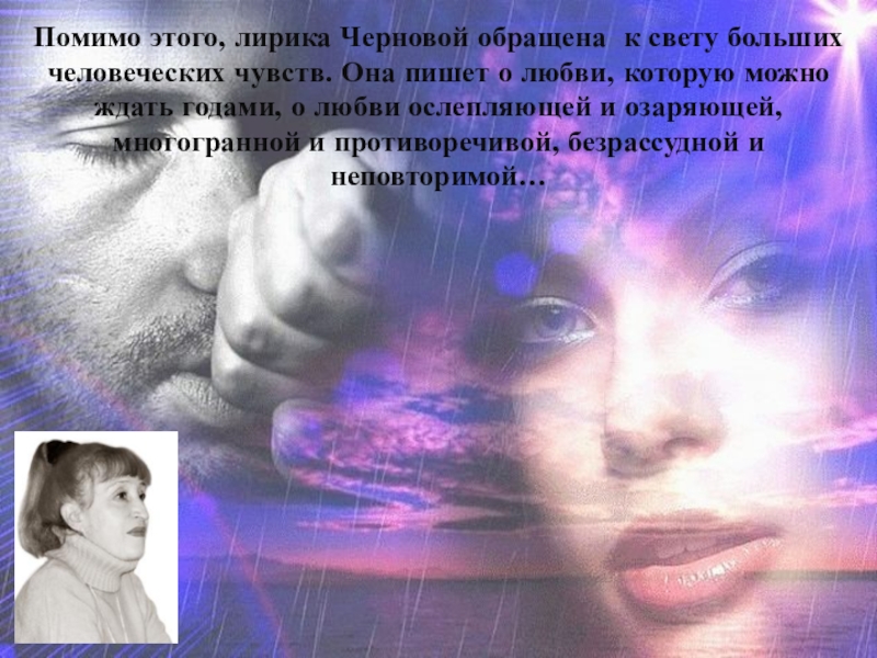 Слайд 15Помимо этого, лирика Черновой обращена к свету больших человеческих чувств. Она