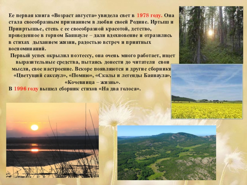 Слайд 8Ее первая книга «Возраст августа» увидела свет в 1978 году. Она