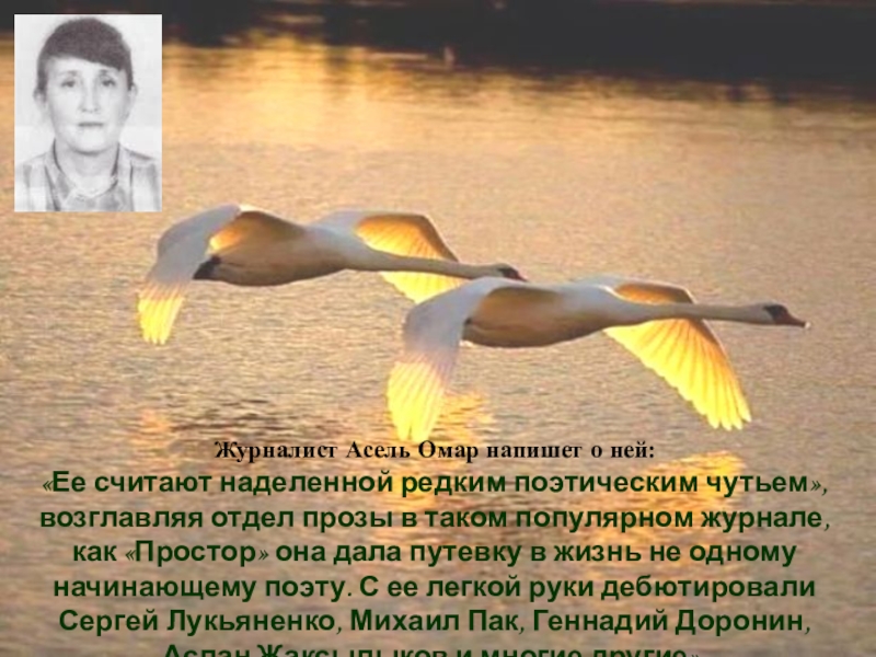 чутьем», возглавляя отдел прозы в таком популярном журнале, как «Простор» она дала путевку в жизнь не одному начинающему поэту. С ее легкой руки дебютировали Сергей Лукьяненко, Михаил Пак, Геннадий Доронин, Аслан Жаксылыков и многие другие».