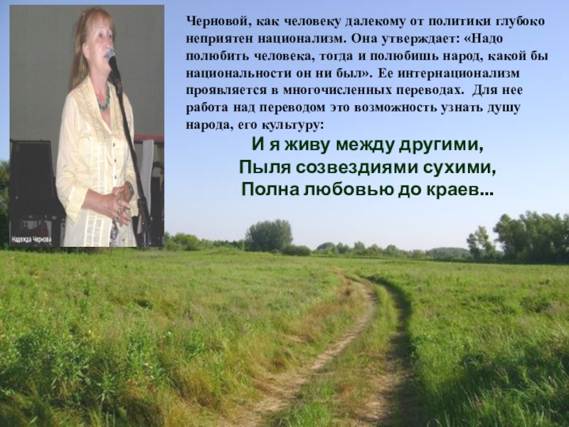 Слайд 22Черновой, как человеку далекому от политики глубоко неприятен национализм. Она утверждает: