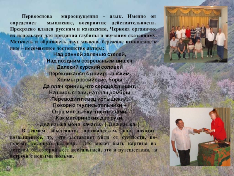 владея русским и казахским, Чернова органично их использует для придания глубины и звучания сказанному. Меткость и образность двух языков, бережное отношение к ним – несомненное достоинство автора: