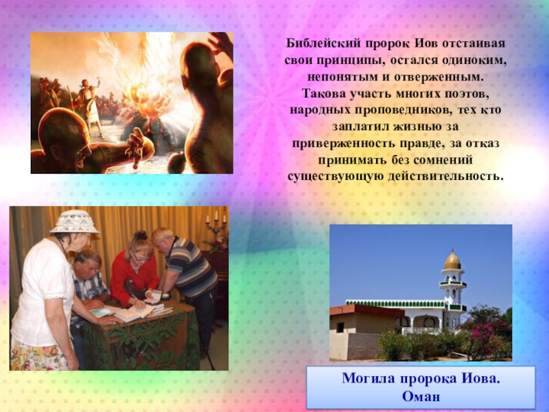 Слайд 19Библейский пророк Иов отстаивая свои принципы, остался одиноким, непонятым и отверженным.