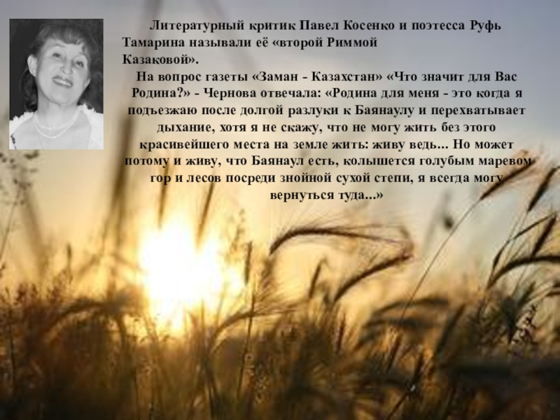 На вопрос газеты «Заман - Казахстан» «Что значит для Вас Родина?» - Чернова отвечала: «Родина для меня - это когда я подъезжаю после долгой разлуки к Баянаулу и перехватывает дыхание, хотя я не скажу, что не могу жить без этого красивейшего места на земле жить: живу ведь... Но может потому и живу, что Баянаул есть, колышется голубым маревом гор и лесов посреди знойной сухой степи, я всегда могу вернуться туда...»