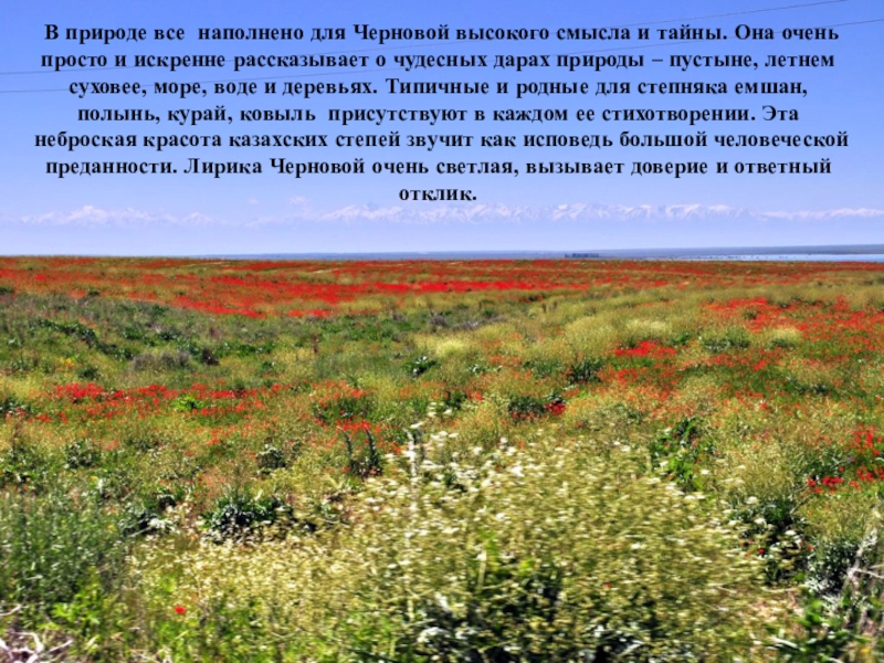 Она очень просто и искренне рассказывает о чудесных дарах природы – пустыне, летнем суховее, море, воде и деревьях. Типичные и родные для степняка емшан, полынь, курай, ковыль присутствуют в каждом ее стихотворении. Эта неброская красота казахских степей звучит как исповедь большой человеческой преданности. Лирика Черновой очень светлая, вызывает доверие и ответный отклик.