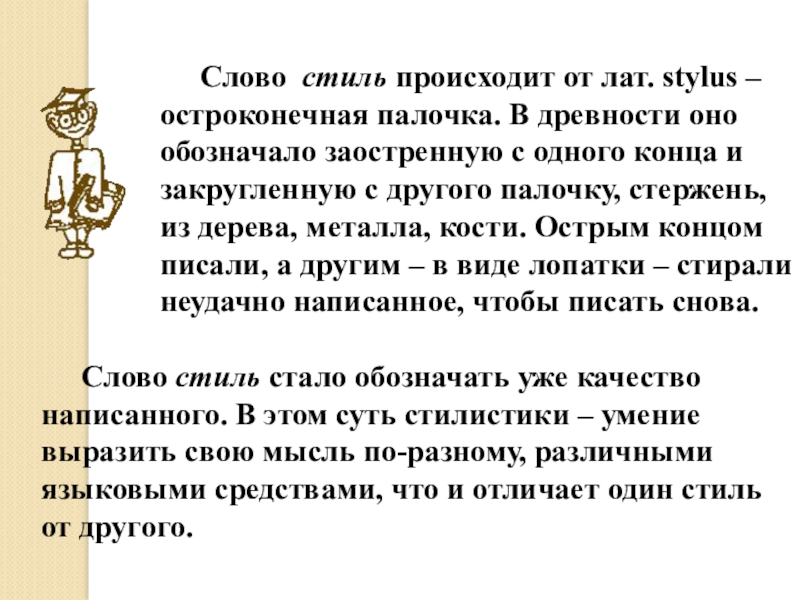 Слово стиль стало обозначать уже качество написанного. В этом суть стилистики – умение выразить свою мысль по-разному, различными языковыми средствами, что и отличает один стиль от другого.