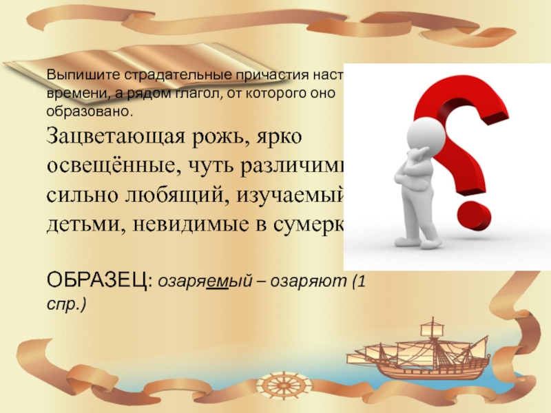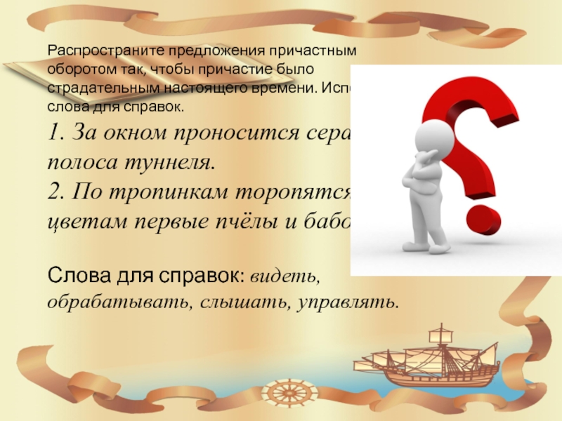 Слайд 13Распространите предложения причастным оборотом так, чтобы причастие было страдательным настоящего времени.