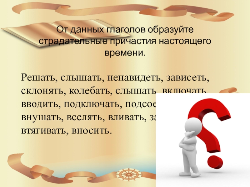 Слайд 9От данных глаголов образуйте страдательные причастия настоящего времени.