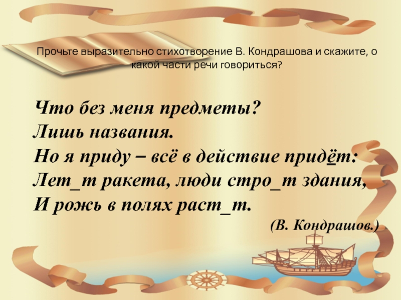 Прочьте выразительно стихотворение В. Кондрашова и скажите, о какой части речи