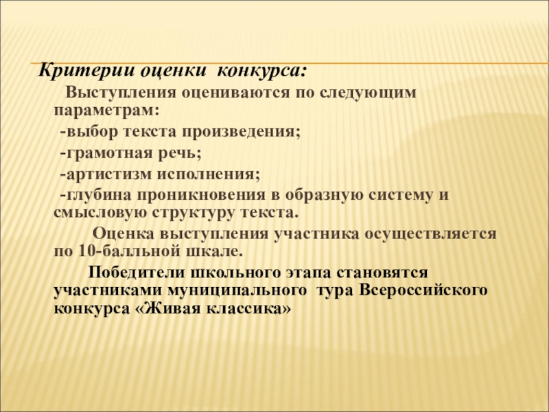 Критерии оценки конкурса:	 Выступления оцениваются по следующим параметрам:	-выбор текста произведения;	-грамотная речь;	-артистизм исполнения;	-глубина проникновения в образную систему