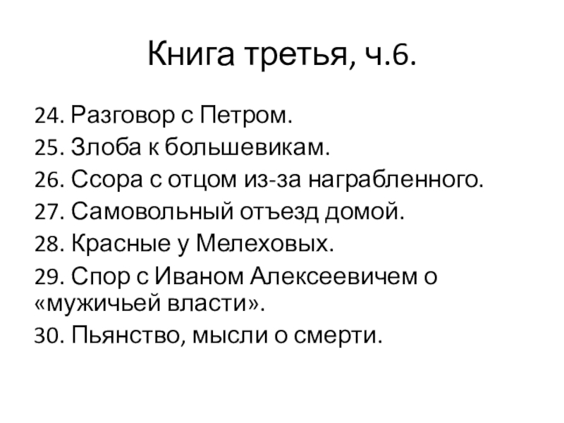 Книга третья, ч.6.24. Разговор с Петром.25. Злоба к большевикам.26. Ссора с отцом из-за награбленного.27. Самовольный отъезд домой.28.