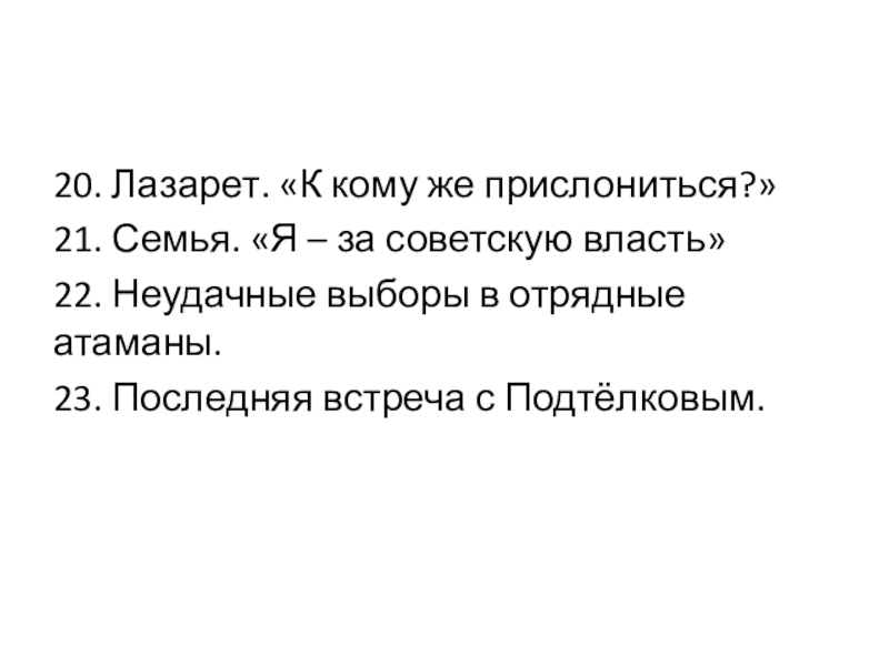 20. Лазарет. «К кому же прислониться?»21. Семья. «Я – за советскую власть»22. Неудачные выборы в отрядные атаманы.23.