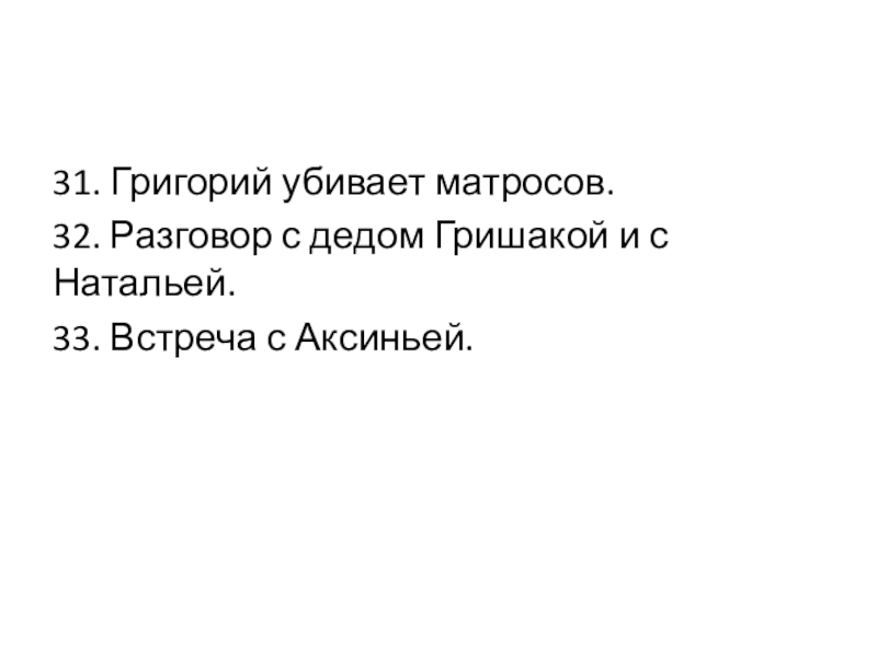 31. Григорий убивает матросов.32. Разговор с дедом Гришакой и с Натальей.33. Встреча с Аксиньей.
