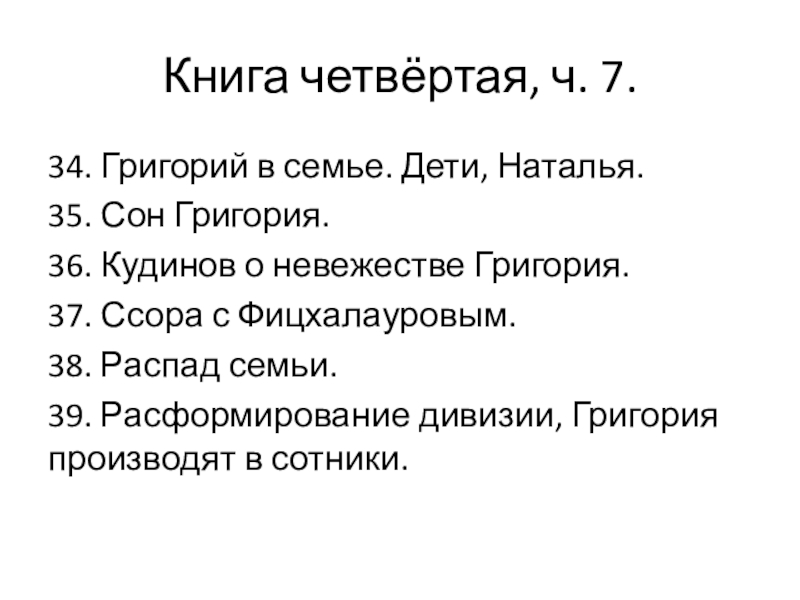 Книга четвёртая, ч. 7.34. Григорий в семье. Дети, Наталья.35. Сон Григория.36. Кудинов о невежестве Григория.37. Ссора с