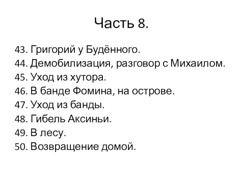 Часть 8.43. Григорий у Будённого.44. Демобилизация, разговор с Михаилом.45. Уход из хутора.46. В банде Фомина, на острове.47.