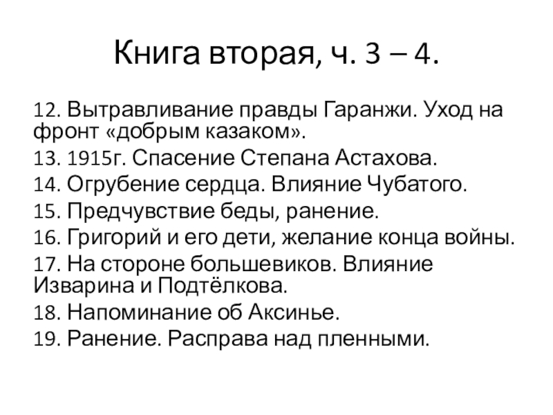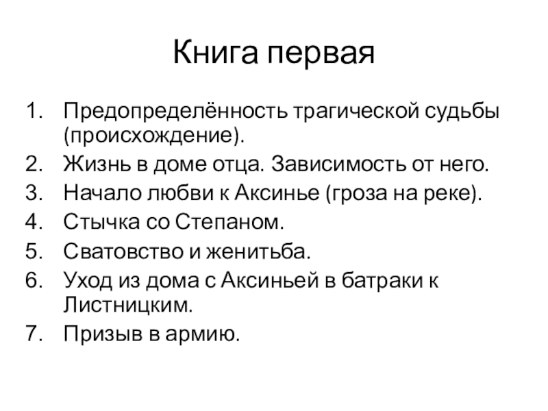 Книга перваяПредопределённость трагической судьбы(происхождение).Жизнь в доме отца. Зависимость от него.Начало любви к Аксинье (гроза на реке).Стычка со Степаном.Сватовство и женитьба.Уход из дома с Аксиньей в батраки к Листницким.Призыв в армию.