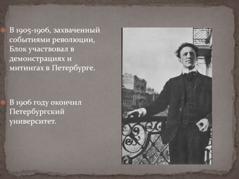 В 1905-1906, захваченный событиями революции, Блок участвовал в демонстрациях и митингах