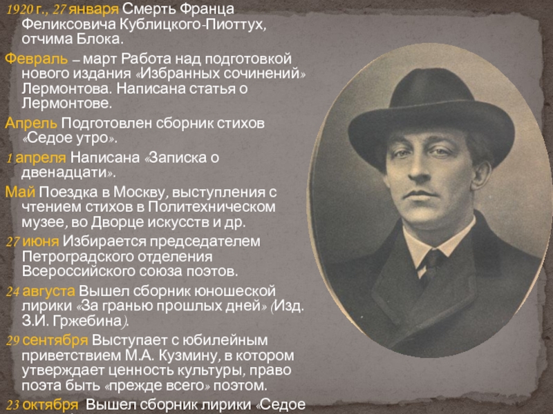 Слайд 371920 г., 27 января Смерть Франца Феликсовича Кублицкого-Пиоттух, отчима Блока.
