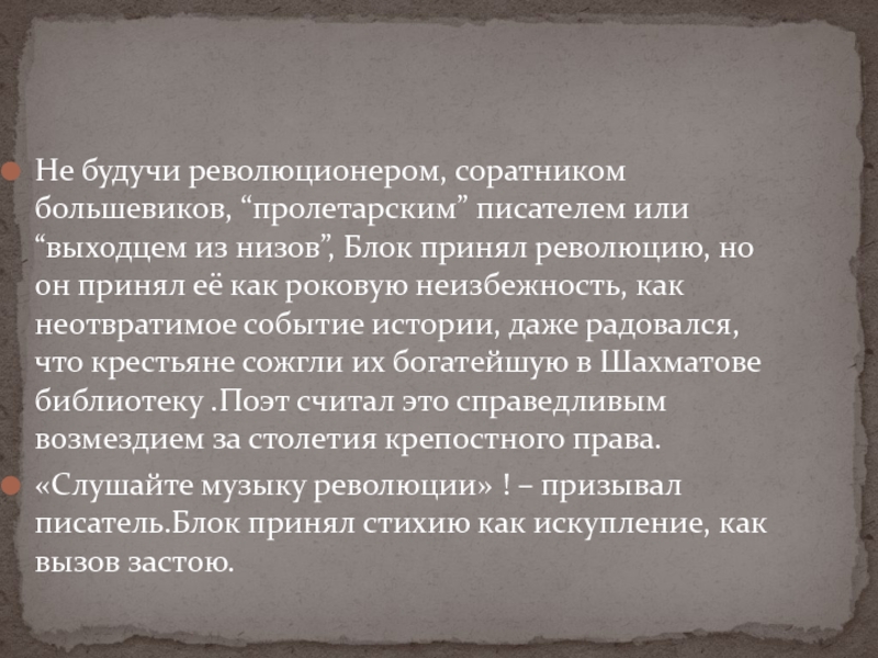Блок принял революцию, но он принял её как роковую неизбежность, как неотвратимое событие истории, даже радовался, что крестьяне сожгли их богатейшую в Шахматове библиотеку .Поэт считал это справедливым возмездием за столетия крепостного права.