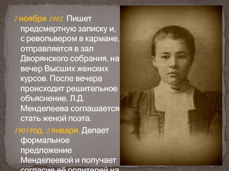 1903 год, 2 января. Делает формальное предложение Менделеевой и получает согласие её родителей на брак.
