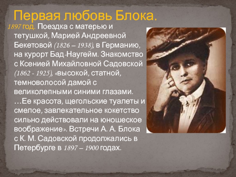 – 1938), в Германию, на курорт Бад-Наугейм. Знакомство с Ксенией Михайловной Садовской (1862 - 1925), «высокой, статной, темноволосой дамой с великолепными синими глазами. …Ее красота, щегольские туалеты и смелое, завлекательное кокетство сильно действовали на юношеское воображение». Встречи А. А. Блока с К. М. Садовской продолжались в Петербурге в 1897 – 1900 годах.