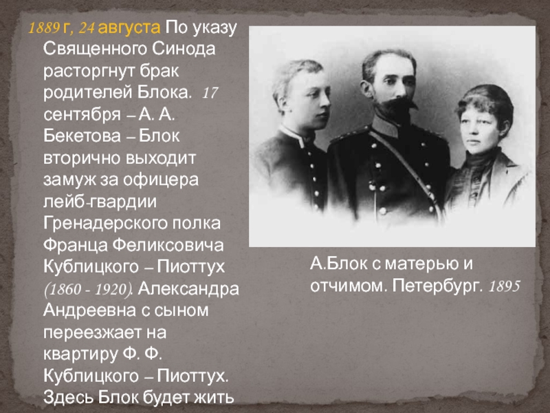 Блока. 17 сентября – А. А. Бекетова – Блок вторично выходит замуж за офицера лейб-гвардии Гренадерского полка Франца Феликсовича Кублицкого – Пиоттух (1860 - 1920). Александра Андреевна с сыном переезжает на квартиру Ф. Ф. Кублицкого – Пиоттух. Здесь Блок будет жить до осени 1906 г.