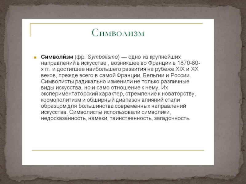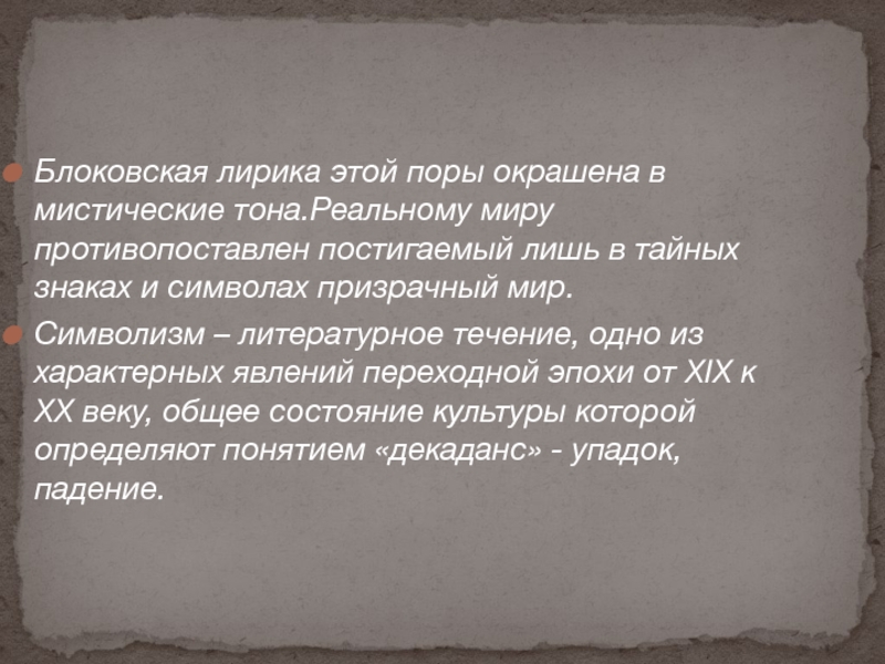 Символизм – литературное течение, одно из характерных явлений переходной эпохи от XIX к XX веку, общее состояние культуры которой определяют понятием «декаданс» - упадок, падение.