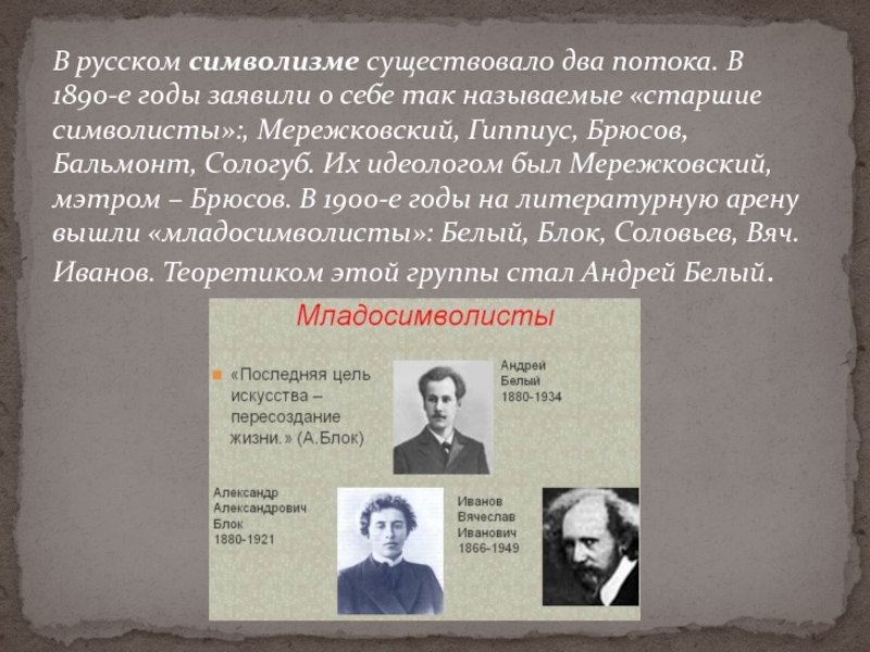 себе так называемые «старшие символисты»:, Мережковский, Гиппиус, Брюсов, Бальмонт, Сологуб. Их идеологом был Мережковский, мэтром – Брюсов. В 1900-е годы на литературную арену вышли «младосимволисты»: Белый, Блок, Соловьев, Вяч. Иванов. Теоретиком этой группы стал Андрей Белый.