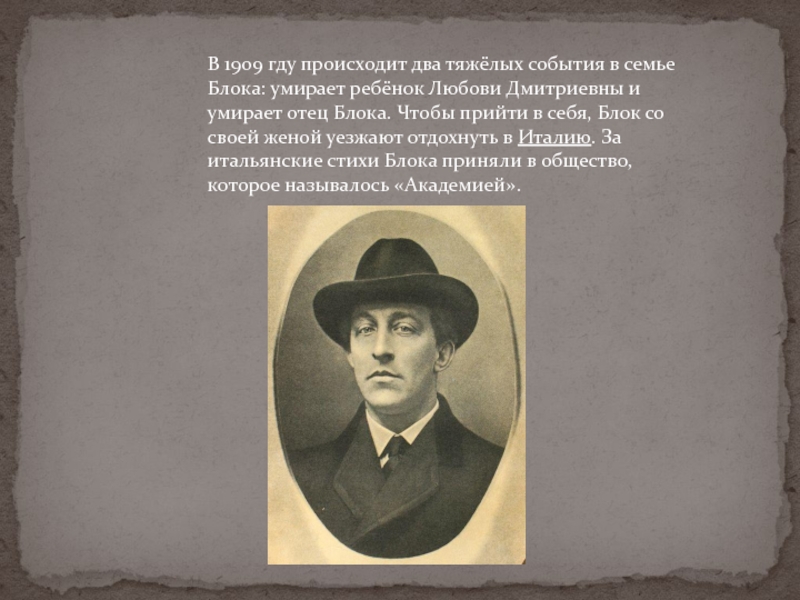 Дмитриевны и умирает отец Блока. Чтобы прийти в себя, Блок со своей женой уезжают отдохнуть в Италию. За итальянские стихи Блока приняли в общество, которое называлось «Академией».