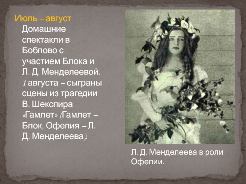 Л. Д. Менделеевой. 1 августа – сыграны сцены из трагедии В. Шекспира «Гамлет» (Гамлет – Блок, Офелия – Л.Д. Менделеева).