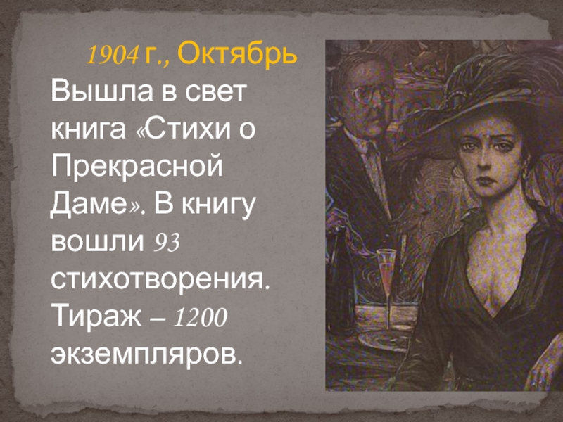 «Стихи о Прекрасной Даме». В книгу вошли 93 стихотворения. Тираж – 1200 экземпляров.