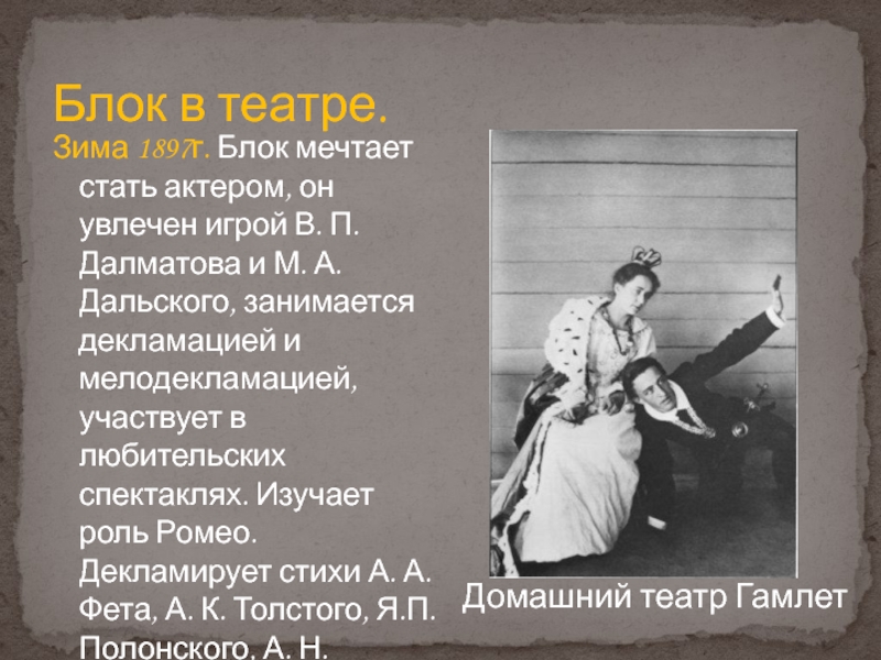 Слайд 10Зима 1897г. Блок мечтает стать актером, он увлечен игрой В. П.