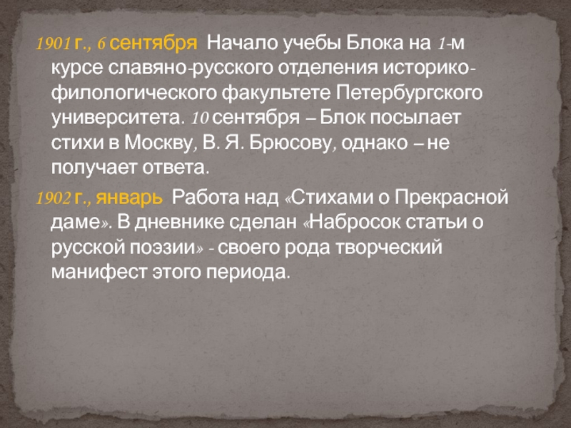 отделения историко-филологического факультете Петербургского университета. 10 сентября – Блок посылает стихи в Москву, В. Я. Брюсову, однако – не получает ответа.