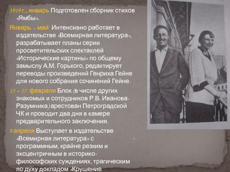 Слайд 361919 г., январь Подготовлен сборник стихов «Ямбы».