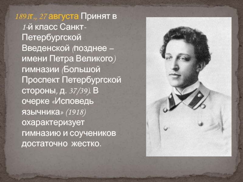 имени Петра Великого) гимназии (Большой Проспект Петербургской стороны, д. 37/39). В очерке «Исповедь язычника» (1918) охарактеризует гимназию и соучеников достаточно жестко.